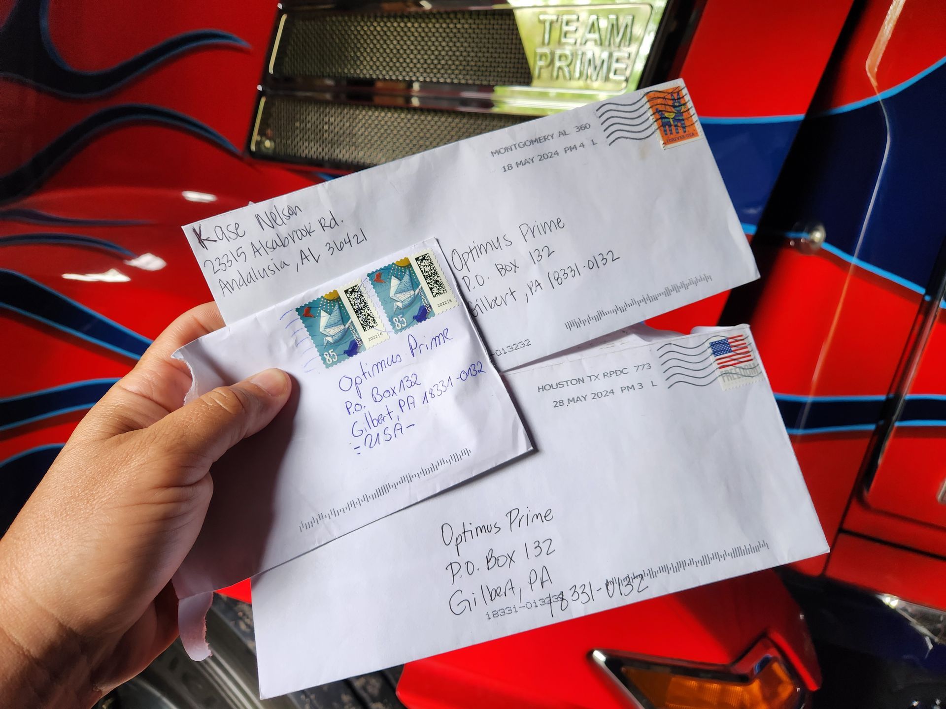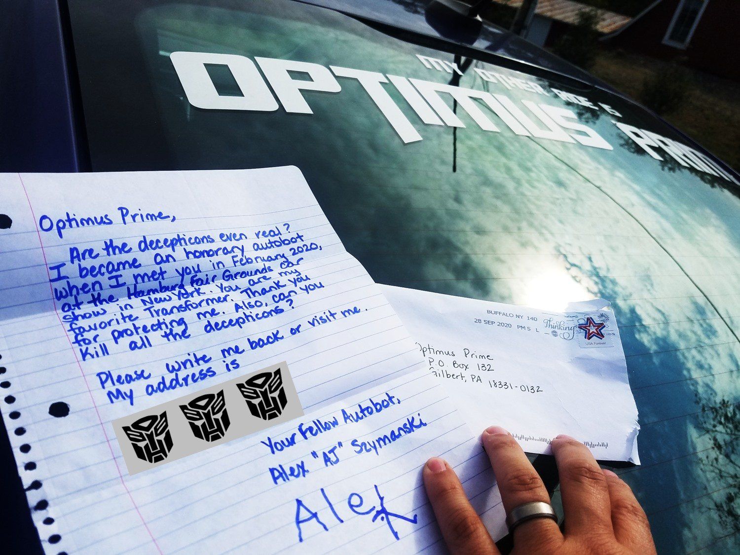 Optimus Prime is a fictional character. This address has been setup by Joe Fiduccia, the owner of the Optimus Prime replica truck, to provide a way for fans and children to communicate with their childhood hero. Letters and packaging are not sent to the "real" Optimus Prime, nor are they sent to anyone at Hasbro, Paramount Pictures, or any of the actors and actresses from the feature films. $10.00 USD covers ONE mailing to any single individual within the continental USA. If more than one response is requested, $10 extra per response should be added to your payment. Please message us for international mailing rates. Upon receipt of your letter, response times (if requested) vary greatly depending on the time of year. But most responses are mailed out within 1 - 3 weeks.