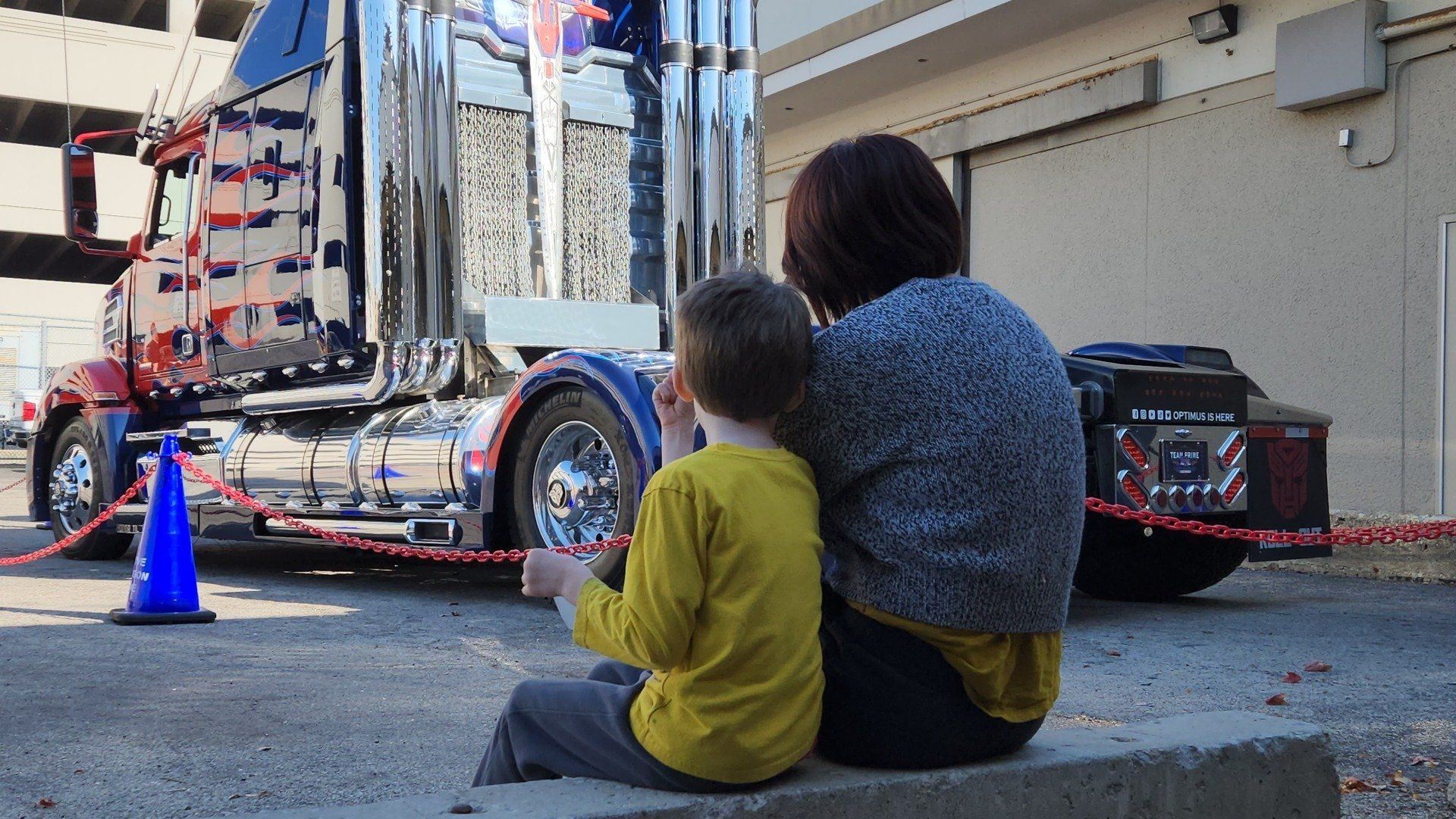 But when we say Optimus is an experience, we mean it. The owners of this replica bring their truck to life with props, signage, lighting, sound effects, and more (as conditions and placement permit). They hand out pictures and stickers to families, they interact with fans who stop by, and set up scheduled times throughout the day that Optimus comes to life with voice overs and CO2 demonstrations.